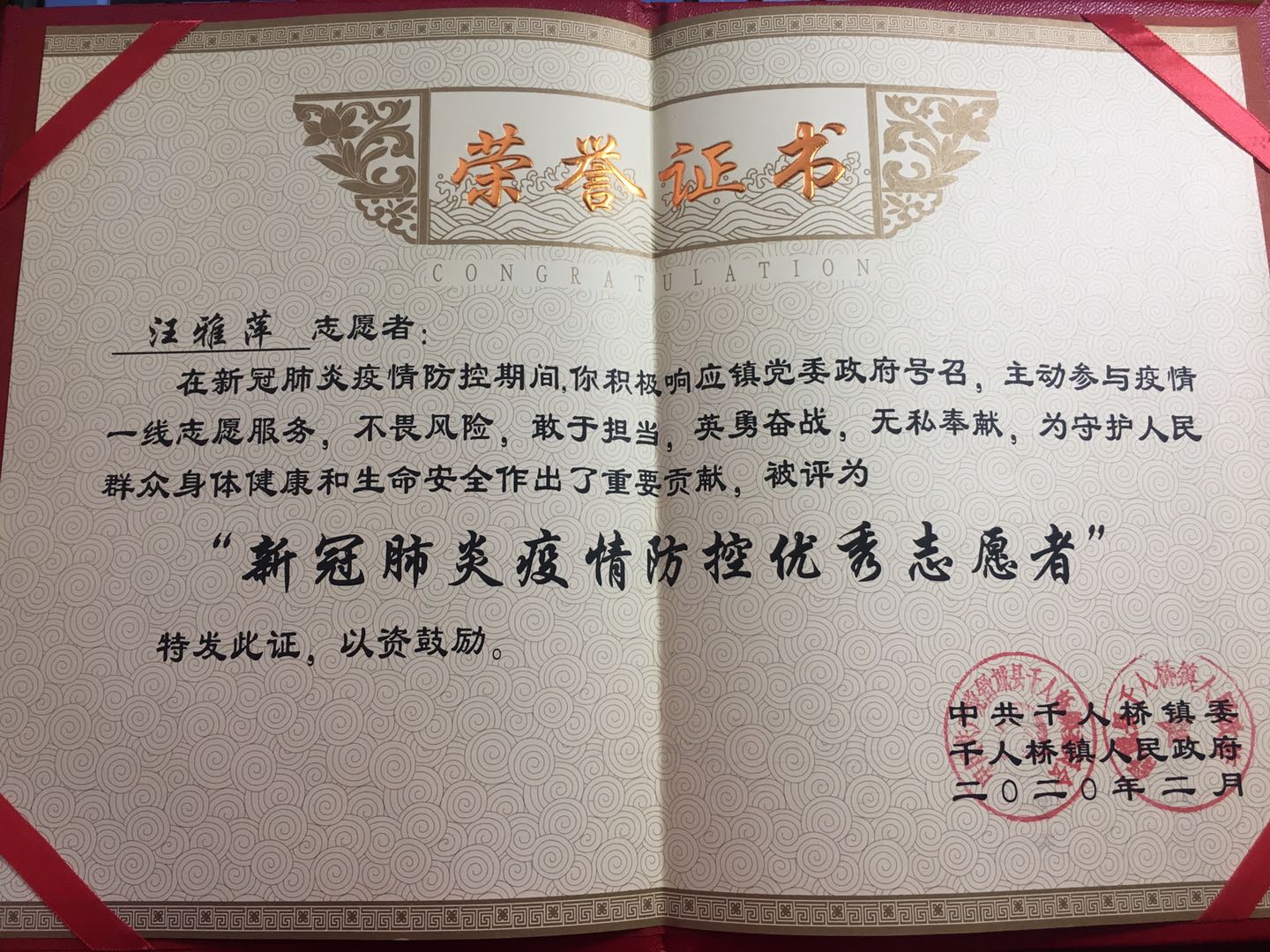 行政管理2017级汪雅萍同学,家在安徽省六安市舒城县千人桥镇。2月7日,她就主动报名加入疫情防控志愿队伍,承担起检疫卡口来往车辆的检测、登记工作。连续11天,汪雅萍每天工作7个小时,因为她说多做一点,村民感染风险的几率就小一点。一个人的力量是微小的,但星星之火可以燎原,她扩充志愿者队伍,让更多的人参与到村委会疫情防控组织中来,形成以她为副队长的青年志愿者队伍。深入乡村发放宣传资料,花样讲解疫情防控知识,让村民们稳定心态科学防疫。有一次她在介绍“七步洗手法”时看到一位老爷爷没戴口罩,把自己每天仅有一只的口罩给了他 ,还教村民们如何正确使用口罩。每一天,在千人桥镇与百神庙镇交叉的卡点上、在农户家门口、在村广播中,都有一个笔挺的身姿、青春的面孔悦耳的声音。新冠疫情防控中,舒城县零病例。近日,千人桥镇党委、镇政府授予她“新冠肺炎疫情防控优秀志愿者”称号。汪雅萍同学说“这是大家都期待已久的结果,也是我们每一个人付出的价值。”她兴奋地说,终于可以安心上学校网课了。