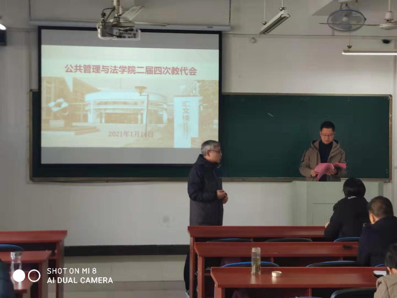 1月14日下午,公共管理与法学院在汇文楼C-302召开二届四次教职工代表大会,正式代表、列席代表参加了会议,学院党委书记胡卫东主持会议。