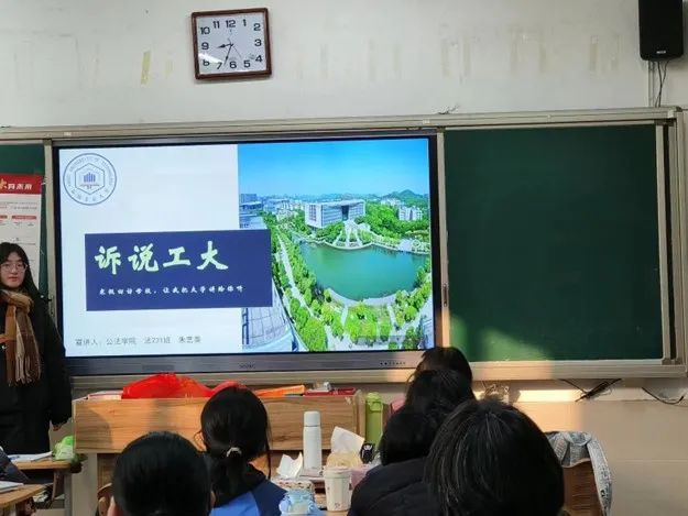 的环境优美宜人,照片上的四季美景和安工大的标志性“打卡点”引来了学弟学妹的阵阵欢呼声,讲台下有学妹发自肺腑地表示:“安工大的白桦林好美啊”。其次,我还向他们介绍我校优质齐全的硬件条件、新鲜可口且种类多样的饭菜、整洁宽敞且温馨的宿舍环境、完备先进的教学设施,学弟学妹看到一张张美食照片呈现在PPT上,不禁发出“哇塞”的感慨,我想他们是在感慨工大的美食“色香味俱全”啊。并且我通过一系列活动组图向无为中学的学弟学妹们介绍我校学子丰富多彩的课余生活,以此展现安工大学子阳光朝气的精神风貌。同时结合我自身当时面临的困难和茫然,指出他们现阶段学习过程中可能会产生的问题,并分享自己高三的经历和一些自己的学习见解。最后,表达对学弟学妹2024年高考大捷、金榜题名的祝福,也再次表示欢迎学弟学妹报考糖心vlog