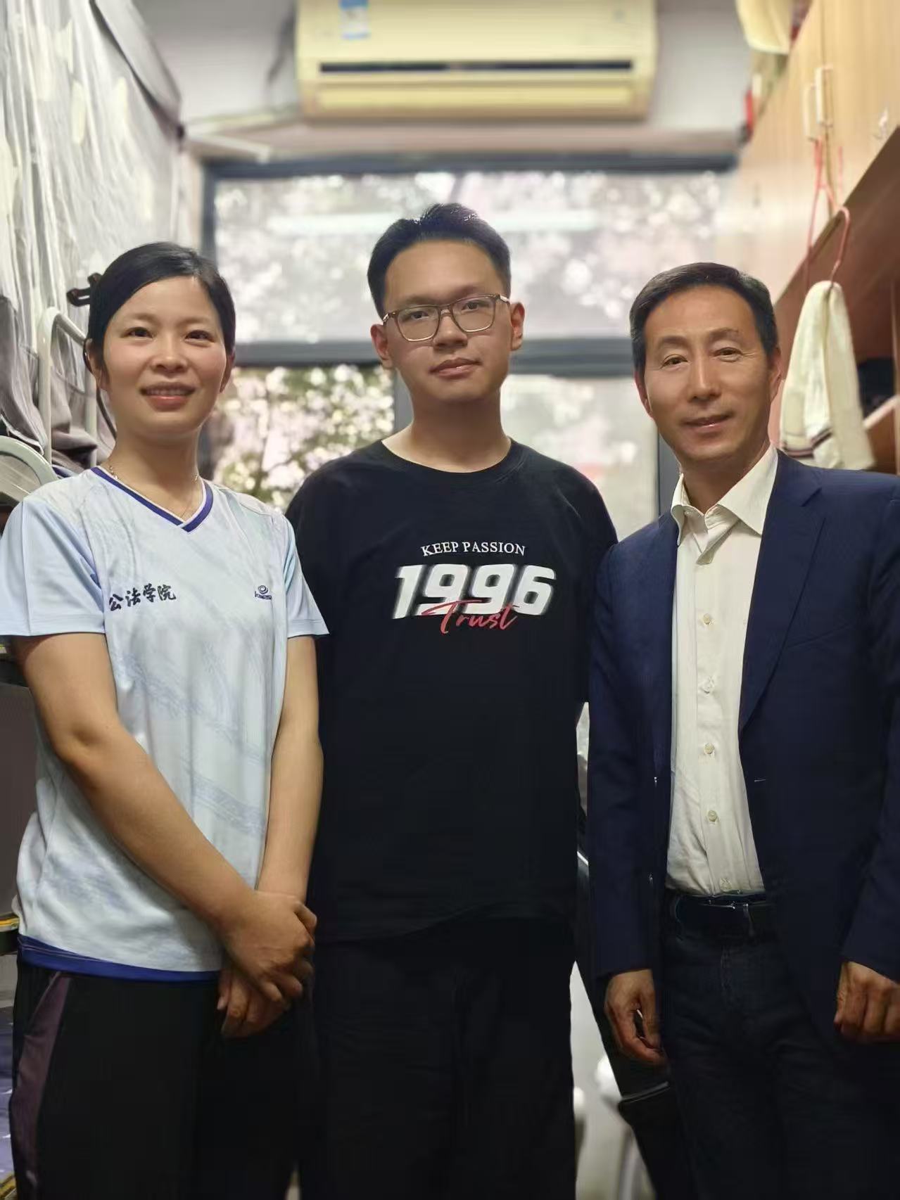 2025年5月24日,学院党委副书记、纪委书记、学生工作副院长周浩然携2023级辅导员专程前往学生宿舍看望造血干细胞捐献志愿者、2023级法学专业法231班潘旭辉同学,对其无私奉献、挽救生命的善举表达高度赞扬与深切关怀。