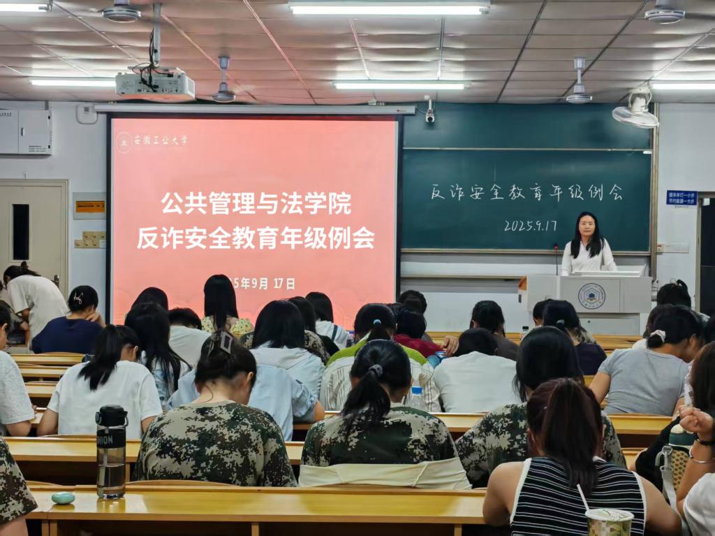 于2025年9月17日,面向全体2025级新生召开反诈安全教育主题年级例会。会议由学院辅导员王秋丽主持,为新生上好入学安全“第一课”。