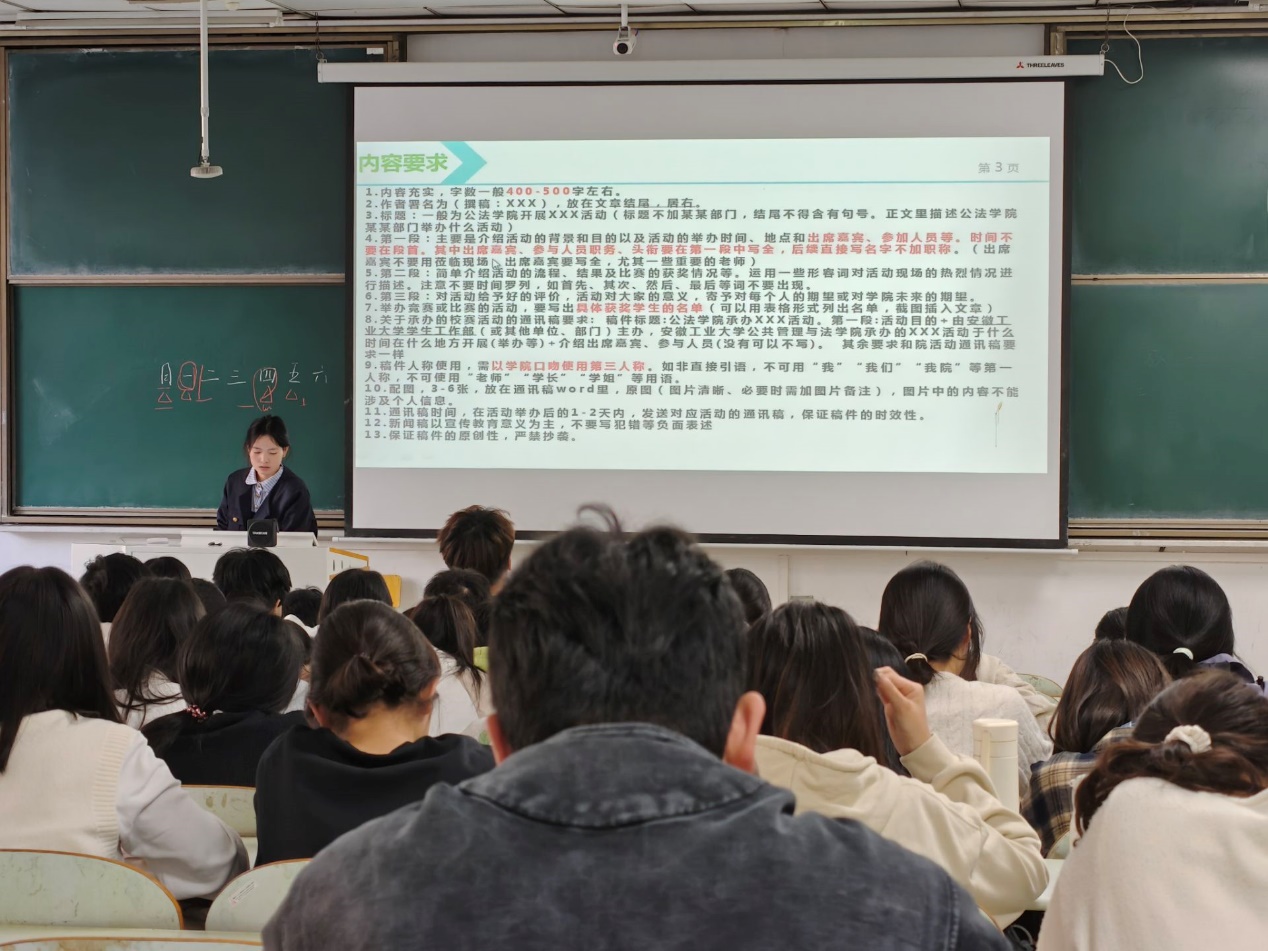 本次培训围绕通讯稿写作的核心要点,从内容架构、格式规范、语言表达、配图标准等维度逐层深入,涉及通讯稿内容,照片拍摄,字体字号等要求。孟瑞华结合学院通讯稿实例,拆解标题拟定、段落布局的技巧,强调通讯稿内容需采用背景目的、流程现场、意义评价的三段式结构,明确了内容充实、语言客观精炼的写作原则。同时针对赛事类稿件的获奖名单呈现、校赛承办类稿件的主体表述等特殊要求进行说明,补充了固定表述使用与照片拍摄及呈现的具体要求。培训会现场气氛专注热烈,参会人员认真记录要点,积极参与交流。