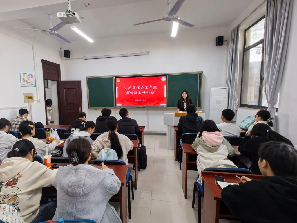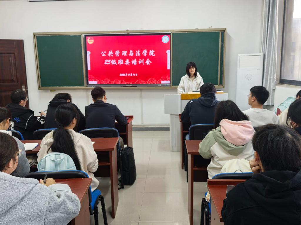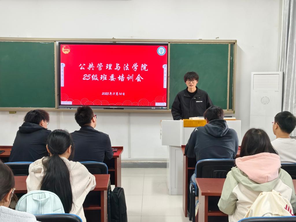 主席团在公法楼110教室开展2025级新生班委培训会。院学生会主席团成员余天阳、24级班长杜森、崔紫怡、团支书李璐璐、25级各班班长、团支书及学习委员参会。