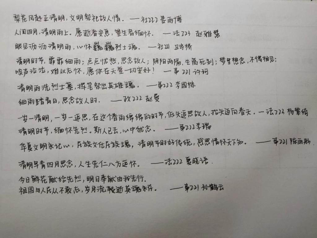 此次活动以“清明时节,寄语相思”为主题,以班级为单位,由各班宣传委员积极动员学生撰写寄语并统一收集,最终精选优秀寄语进行展示: