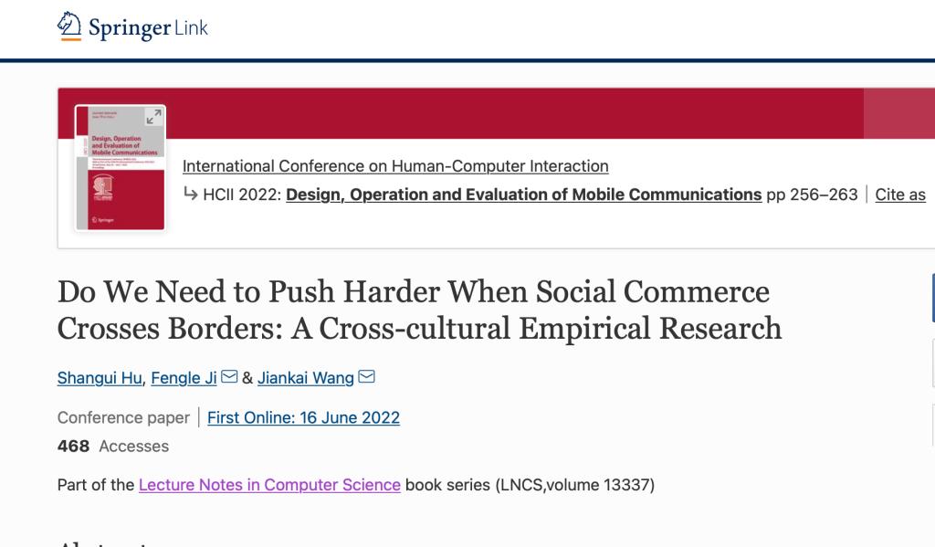 王建凯同学在 HCII 2022在线发表最新研究成果 “Do We Need to Push Harder When Social Commerce Crosses Borders: A Cross-cultural Empirical Research”(//link.springer.com/chapter/10.1007/978-3-031-05014-5_21)。胡善贵副教授为第一作者,我校为第一单位,通讯作者为糖心vlog
