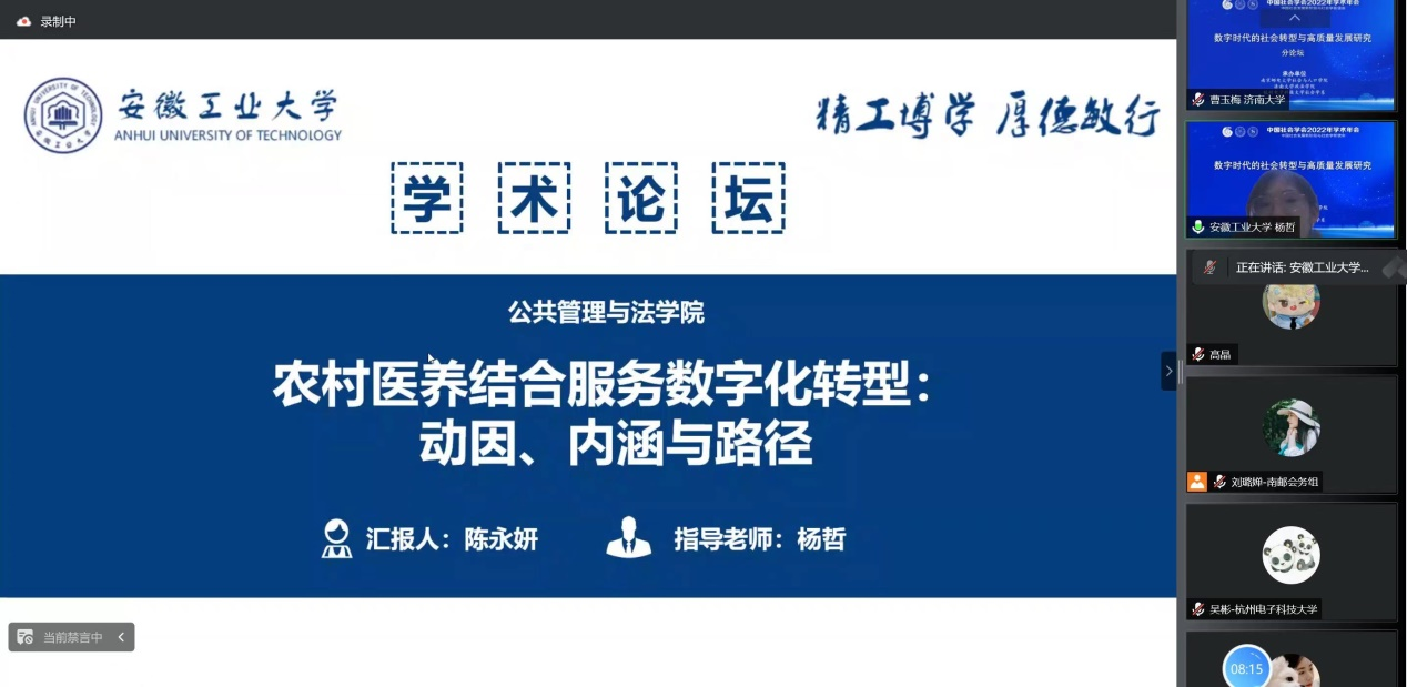 师生杨哲、陈永妍、王佩佩提交论文:农村医养结合服务数字化转型:动因、内涵与路径,入选该分论坛,陈永妍在该分论坛汇报,并于汇报结束,就汇报内容与会专家进行了友好的学术交流。