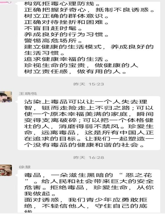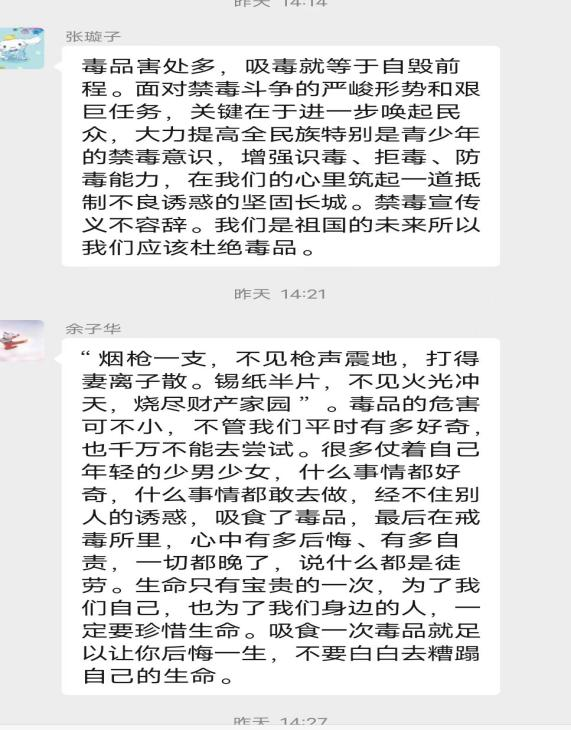 20级法硕团支部以“健康人生,远离毒品”为主题,召开线上禁毒知识学习座谈会。在座谈会后团员们积极发表学习感悟,表示“毒品是社会毒瘤,毒品给旧中国带来的耻辱不能忘怀”;“每年都有年轻的缉毒警失去生命,缉毒警的家庭受到毒贩的残忍报复,吸毒就是毒贩的帮凶”。