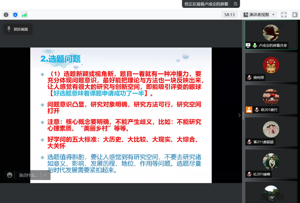 会上,舒婷同学分享了自己参加“互联网+”大赛时遇到的困难及积累的经验,强调了团队组长的重要性。李雯君同学从“大创申报前的注意问题、项目进行中的问题、自己的感受和收获”三个方面做了发言。卢成会老师结合科研竞赛的具体要求,全面介绍了赛事的宗旨、目标和学科规范,对选题的标准、方向、原则和方法进行了详细的分析,对文献综述、研究内容设计、调研报告撰写等大赛过程中的具体问题进行了指导。邢维迢老师最后提醒同学们要认真研读相关比赛文件,明确参赛流程,把握好时间节点,多向指导老师请教。