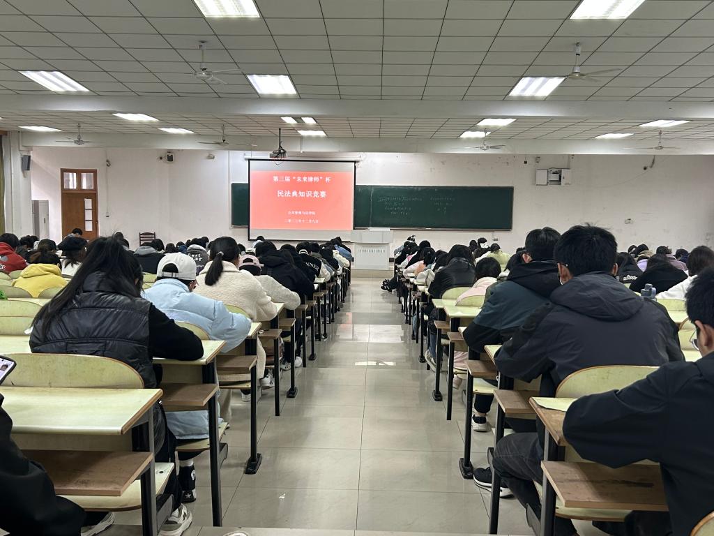 在佳山校区教三南103举行第三届“未来律师”杯《中华人民共和国民法典》知识竞赛,来自各年级的143名学生现场参赛。