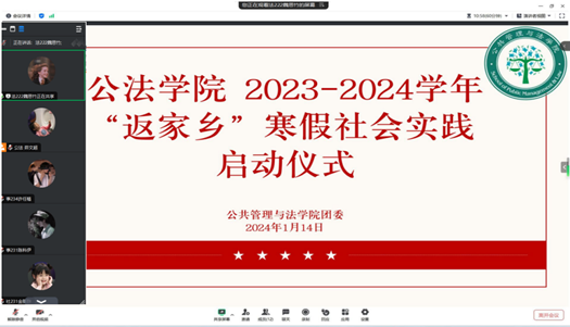 采取线上形式举办了2023-2024学年“返家乡”寒假社会实践启动仪式。学院团委书记朱玲、团学骨干和参与寒假社会实践的同学们一同参加了此次启动仪式。