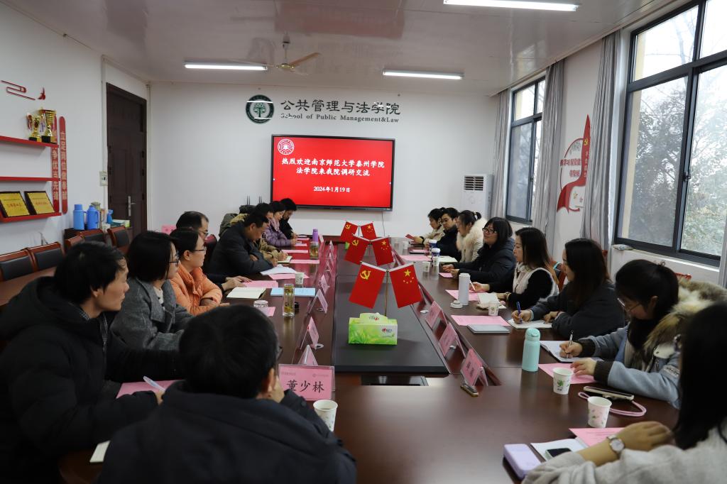 办学发展、本科专业设置、师资队伍建设、人才培养模式及改革等方面的主要情况。黄嘉璐副院长介绍了南京师范大学泰州学院法学院的发展概况、法学教研室及行政管理教研室的专业建设、社会实践基地、产教融合等方面的基本情况。法学系党支部书记戚枝淬、行政管理系主任吴丽丽分别就各自专业发展历史与概况、人才培养方案、人才培养模式以及课程设置等情况进行了汇报交流。集中交流后,法学与行政管理两个专业又分组进行了专业建设研讨。