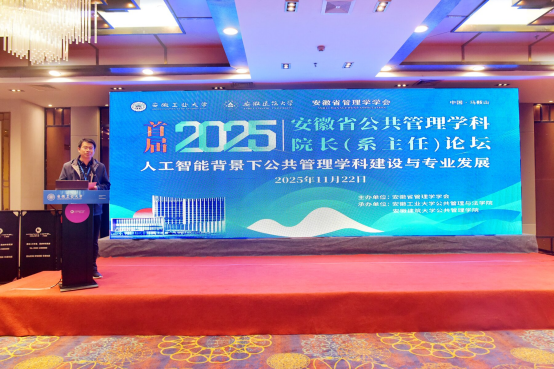 陆林在致辞中介绍了学校办学历史以及在学科发展、专业建设等方面取得的成绩。他指出,党的二十届四中全会为“十五五”时期发展擘画蓝图,其中“进一步全面深化改革取得新突破”“推进治理体系现代化”等部署,与公共管理学科的新使命新任务高度契合。举办首届(2025)公共管理学科院长(系主任)论坛是安徽省公共管理学科发展史上开创性、里程碑式的重要事件,意义重大。本次论坛聚焦“人工智能背景下公共管理学科建设与专业发展”这一主题,正是深入学习领会习近平总书记关于社会治理的重要论述,认真贯彻落实党的二十大和二十届历次全会精神的具体实践,也是我省公共管理学科主动服务国家重大战略需求、积极赋能省域高质量发展的生动体现。