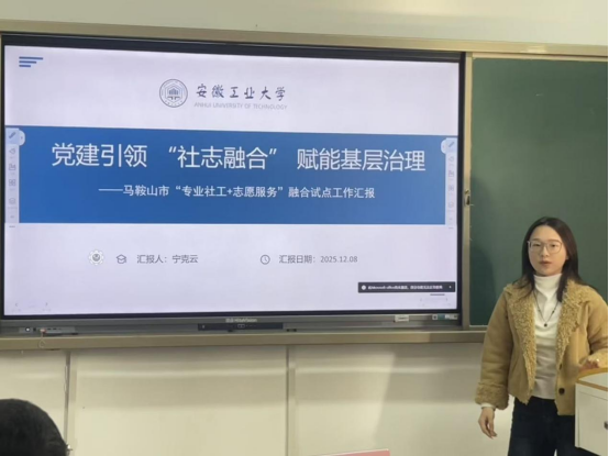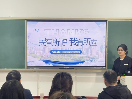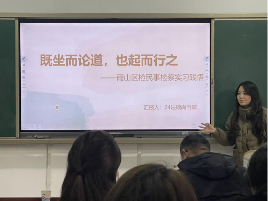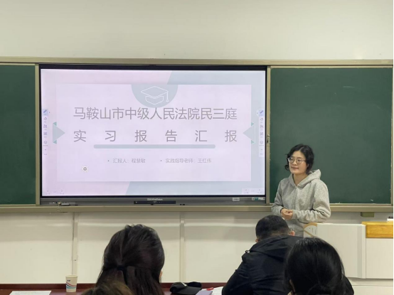 在实习汇报环节,公共管理学2025级研究生宁克云、胡婧分别以《党建引领“社志融合” 赋能基层治理——马鞍山市“专业社工+志愿服务”融合试点工作汇报》《基层信访法治化的实践与思考——以打造“无访社区”为目标》为题,汇报了在马鞍山市委社会工作部、马鞍山市信访局的实习成果。公共事业管理专业2026届毕业生、中央民族大学推免研究生陈雨彤以《民有所呼我有所应——以马鞍山市12345政务服务便民热线为例》为题,汇报了在马鞍山市长热线办的实习成果。法律硕士2024级研究生胡智宇、尚雨晴、程慧敏分别以《律师民商事案件业务办理实践》《既坐而论道,也起而行之——雨山区检民事检察实习践悟》《马鞍山市中级人民法院民三庭实习报告》为题,报告了在明博律师事务所、马鞍山市雨山区检察院、马鞍山市中级人民法院的实习成果。参会老师和同学围绕6位同学的实习汇报和实践教学改进,进行了热烈深入的讨论交流。