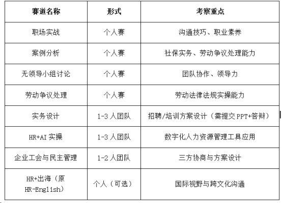 注:HR+出海赛道为个人选参赛道,晋级决赛代表队可任选是否参加,分数不计入团队总分。地区赛是否设置 HR+出海赛道,由赛区组委会自行决定。企业工会与企业民主管理是新增赛道,该赛道在总决赛举行,地区赛暂不举行。