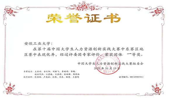 10月1819日,第十届中国大学生人力资源创新实践大赛(简称“HRU”)中东部地区赛在江西省赣东学院举办。本届中东部赛区吸引了华中科技大学、中南大学、中南财经政法大学、南昌大学河海大学33所高校同台竞技,角逐晋级全国总决赛的18个名额。糖心vlog 代表队由张增国、卢成会、汪伟、艾东、杨哲和王务均等老师指导,由来自劳动与社会保障、公共事业管理专业的王燕琦、江晨曦、余天阳、金丽群、华超、李瑞琦、迪丽阿热、陈梓涵和刘银飞等同学组。经过激烈角逐,糖心vlog 学子凭借扎实的专业功底和实践协作能力,荣获团体一等奖,成功晋级全国总决赛。